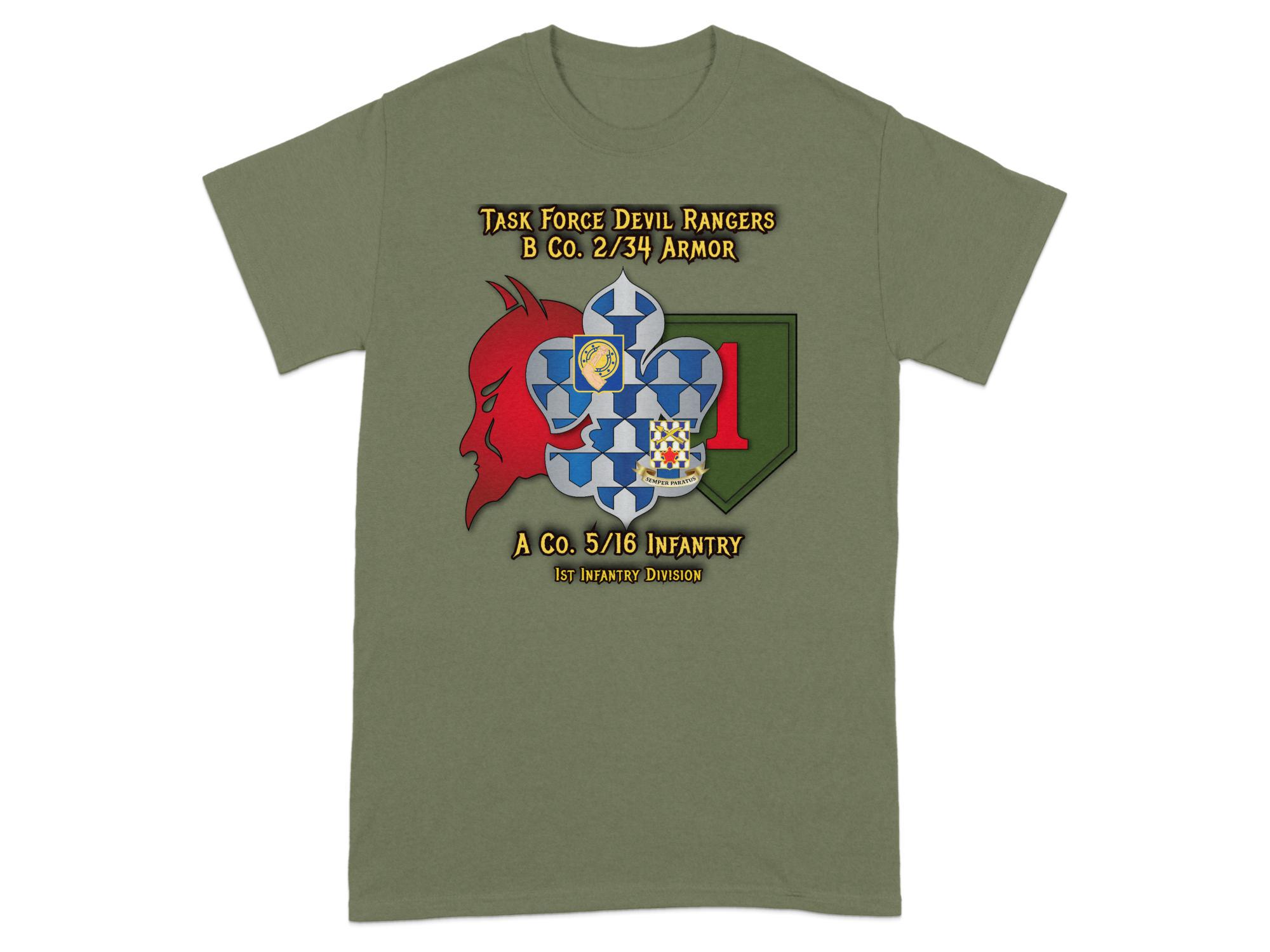 Show off your pride and service with this Task Force Devil Rangers T-Shirt. Featuring a detailed design representing B Co. 234 Armor and A Co. 516 Infantry of the 1st Infantry Division, this military graphic tee is perfect for veterans and supporters. A must-have for anyone wanting to honor the brave US Army soldiers and their dedication. Ideal for casual wearing or as a gift to a beloved veteran or military enthusiast.